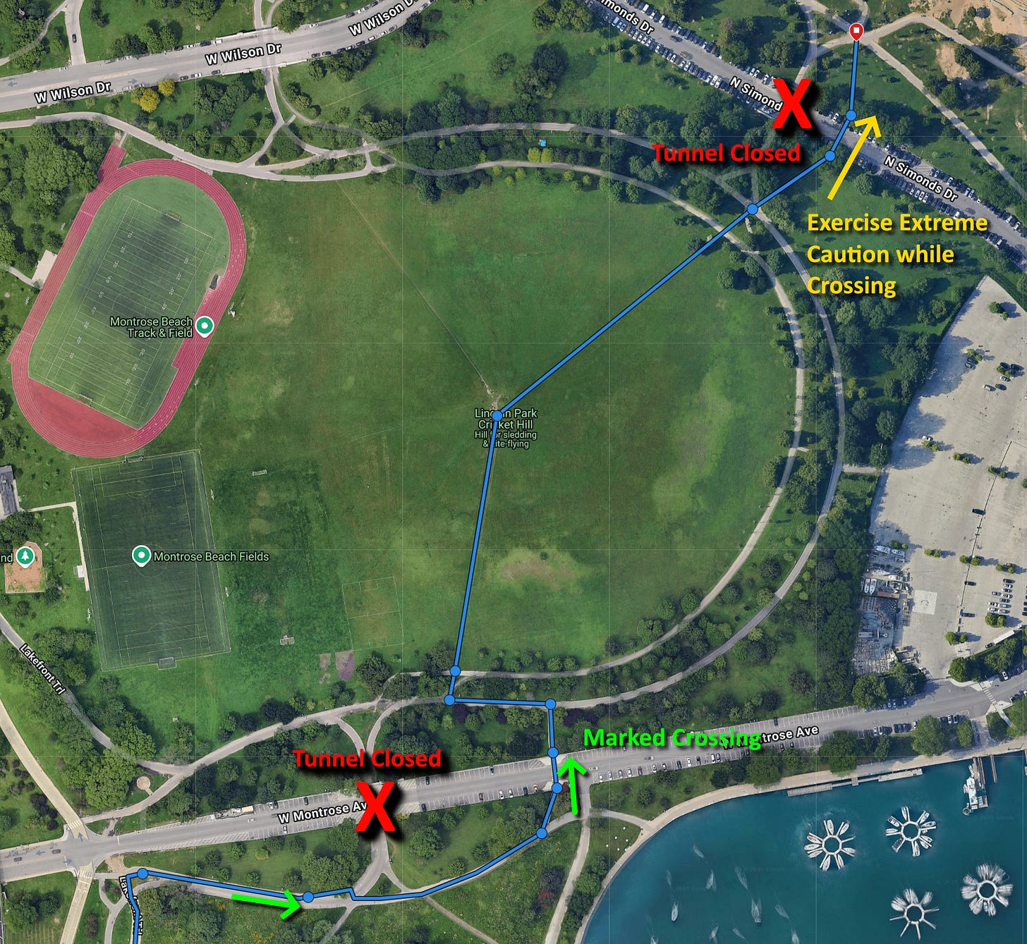 Montrose Bridge is under reconstruction, so there is no passage underneath. When you are coming back north, following the detour signs, you’ll cross Montrose at a temporary stop sign, then curl back to go to the usual path over the hill.